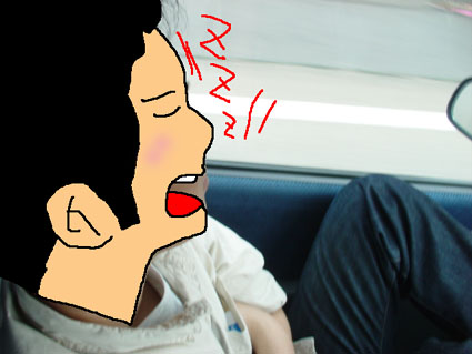 いつもはナベイが運転じゃが、今回は練習もかねてBETAが ハンドルを握る、運転する本人も緊張、助手席のナベイも 後部座席のCANTAも緊張(笑) |